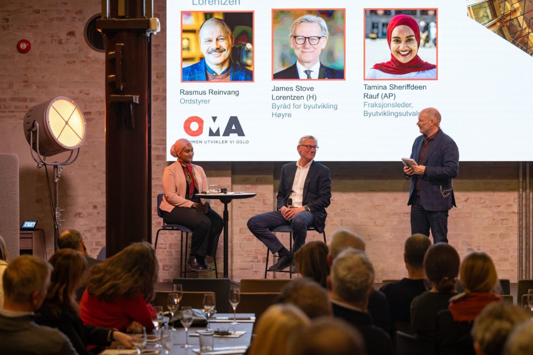Den uformelle delen av årsmøtet ble avsluttet med en politisk samtale ledet av Rasmus Reinvang med Byråd for byutvikling James Stove Lorentzen (H) og Aps byutviklingspolitiske talsperson Tamina Sheriffdeen Rauf, hvor man ble litt bedre kjent med dem begge og deres bakgrunn og reise inn i politikken – og ikke minst deres respektive ambisjoner på vegne av deres partiet og byrådskonstellasjon for den videre byutviklingen i Oslo, hva som forener dem og skiller dem. To sentrale og maktfulle politikere på byutviklingsfeltet i Oslo de neste fire årene.